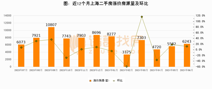 从调价房源来看,2024年6月,上海涨价房源为6243套,较上月上涨11.8%。上海近两个月涨价房源量在5582套以上波动。与此同时,本月涨价房源占比回升,业主信心有所提振。