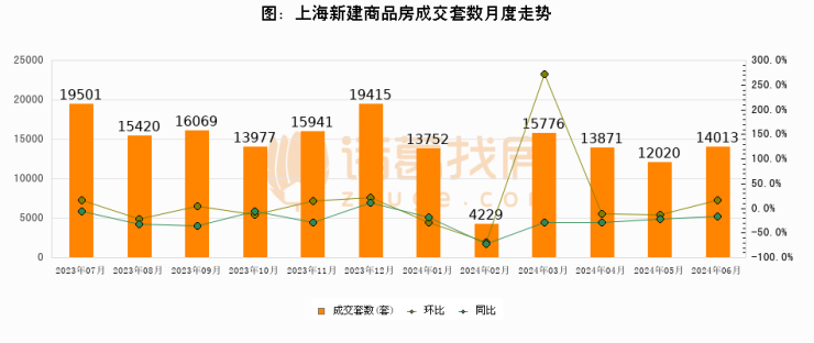 2024年6月,上海新建商品房成交14013套,较上月增加1993套,环比上涨16.6%,同比下降16.9%