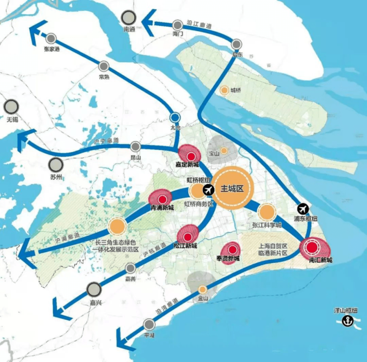 而既有现在,又有未来的大虹桥,真正首轮辐射、助力的区域就是五个新城里的青浦新城!就区位而言,青浦新城东联大虹桥,西接长三角,承接着“上海之门”的重要角色,同时也是青浦的政治,经济、文化中心!青浦新城是上海唯一与江浙两省接壤的区,东可接大虹桥人口外溢利好,西可带动长三角区域产业转移,深度融入长三角。