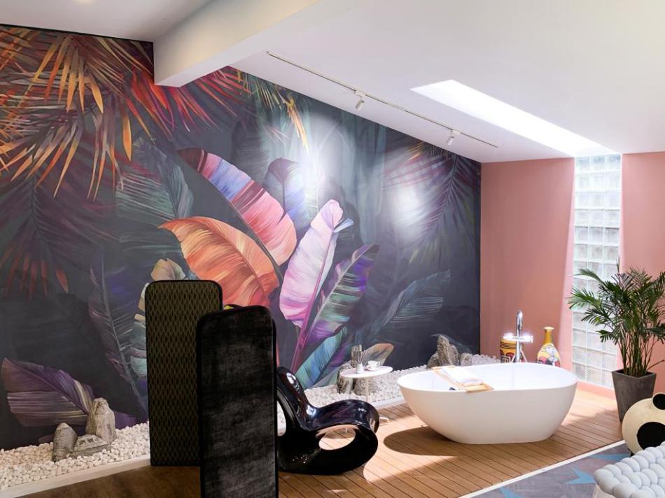 这个半开放浴缸的设计简直太酷了!不仅符合这套奇葩户型的房屋结构,还打破了传统的居住空间模式。浴缸上方开了天井,试想一下,阳光透过窗洒进来,享受自由、无拘无束的沐浴时间,不要太放松哦~小假山和丛林色彩印花墙纸的搭配,真的让人有种身处原生态热带雨林的错觉,完全符合女主人胡一菲的人设!