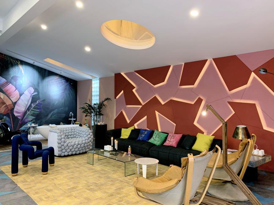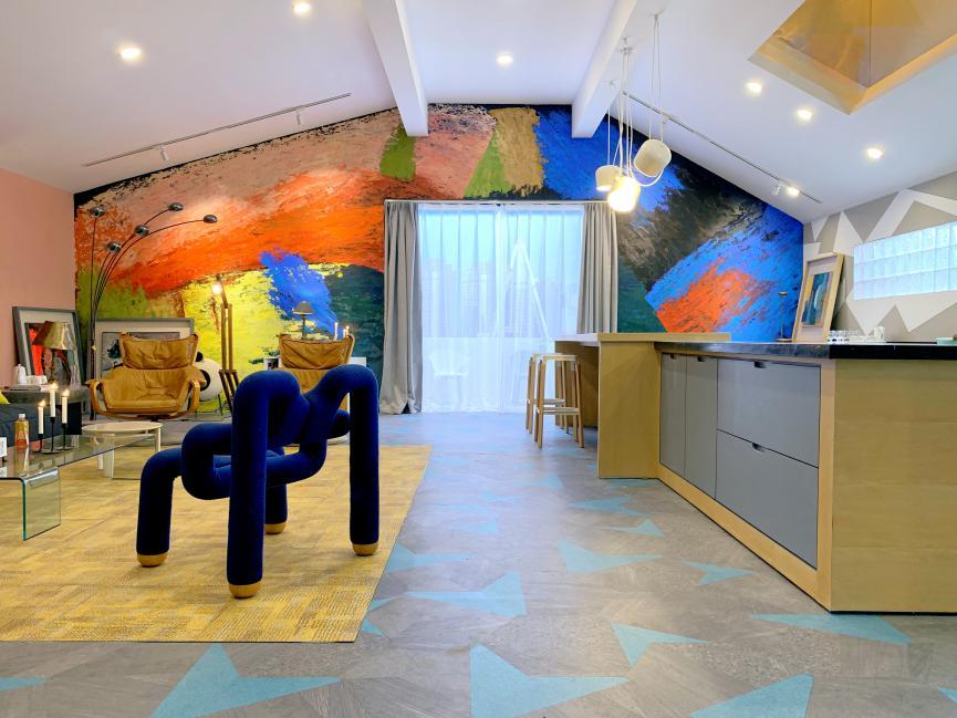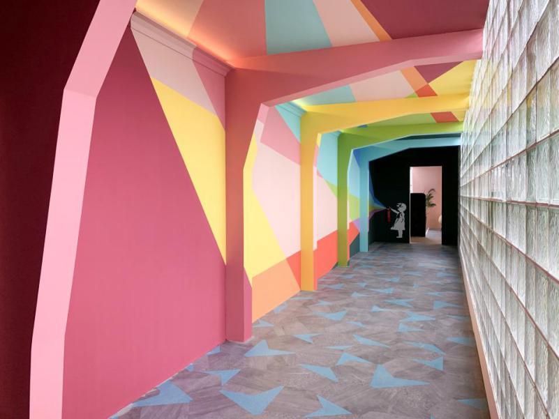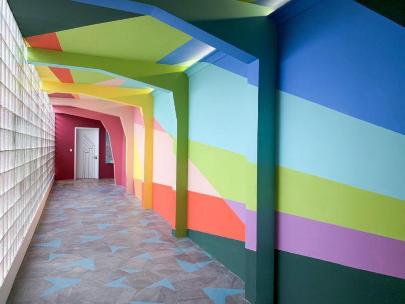 经过法视界国际软装设计总监黄珊老师(剧中为陈若轩饰演)的妙手回春之术,有没有觉得原先长长的“跑道”立马变得很有艺术感!小编排名前列眼就发现了消防栓的设计,这个创意真的绝了!看过剧的都知道曾小贤对于防火这件事很执着,对房子少有的要求就是要有灭火器!据说这个创意还是导演本尊的想法哦,也太真情实感了吧~利用小女孩拿着灭火器喷出彩虹的灵感设计出这个“彩虹走廊”,不仅不会突兀,反而变成了一个加分项。