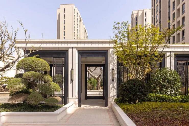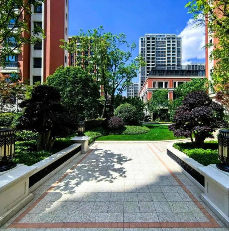 水景、雕塑、草坪、绿植打造生态底色,营造宜居的社区微环境。三棵100多年树龄的朴树各具造型和姿态,松、竹、梅“岁寒三友”,铜鹤,构筑独特意境。风雨连廊取“框景”手法,质感显而易见,所付出的成本更是无需赘述。