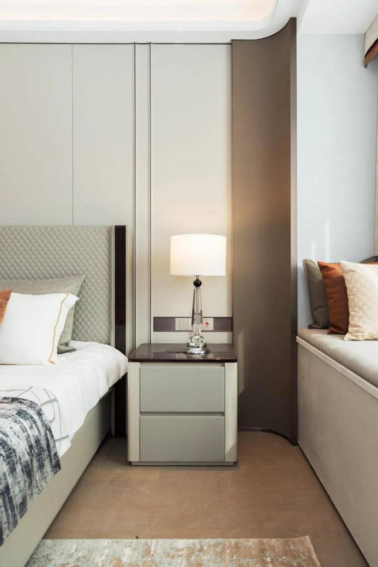 室内空间墙壁材料也是大有文章,根据户型大小,部分墙面采用皮革软包或者木饰面作为交付。以大户型为例,客厅、主卧暖白色的皮革背景墙,手感柔软富有肌理感,在极简线条反衬下,呈现低调奢华的高级感。