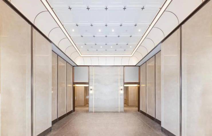 而小区人行主入口大堂和住户单元一楼大堂,均为酒店式挑高设计,背景墙采用巴西银河白奢石,墙面为土耳其天悦米黄,圆弧穹顶搭配星星灯带,细节精妙之处更是数不胜数,营造高定归家仪式感,呈现海派低调奢华的气质。