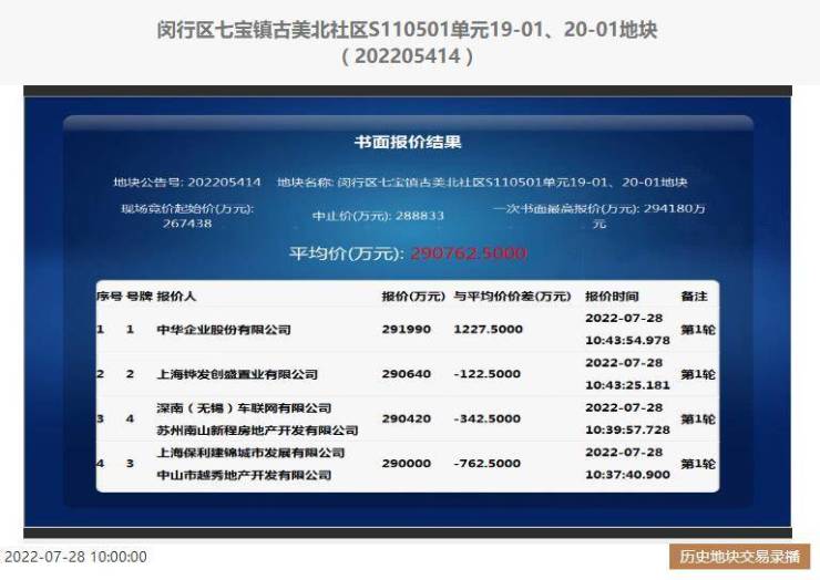 在一次书面报价环节,2号竞买人上海铧发创盛置业有限公司(华发)报价29.064亿元,与平均价价差最小,成功竞得该地块,成交楼板价50653元/㎡,溢价率8.68%。