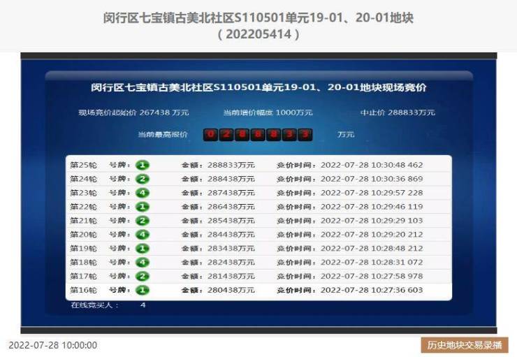 上午10点,闵行区七宝镇古美北社区S110501单元19-01、20-01地块正式进入现场竞价环节,上海土地市场对该地块竞拍过程进行了全程直播。