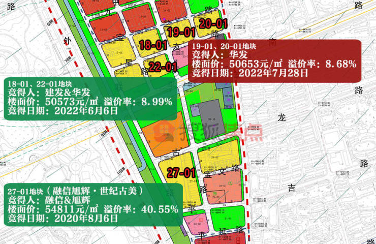 价格方面,地块西侧为2022年6月6日成交的闵行区七宝镇古美北社区S110501单元18-01、22-01地块,由建发&华发竞得,成交总价26.579亿元,楼面价50573元/㎡,溢价率8.99%。