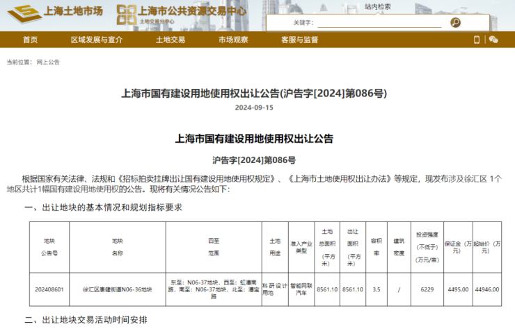 近日,吉利汽车旗下上海吉利翟然汽车设计有限公司以4.49亿元的价格竞得徐汇区康健街道N06-36地块。该地块原为上海老字号冠生园厂房,地块占地8561平方米,容积率为3.5,建筑高度不超过80米,土地出让年限为50年,土地用途为教育科研设计用地。