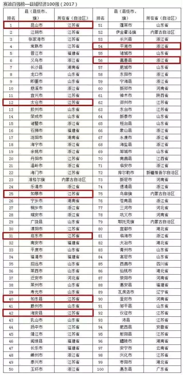 经济实力方面,我们来看一张全国百强县的排行榜: