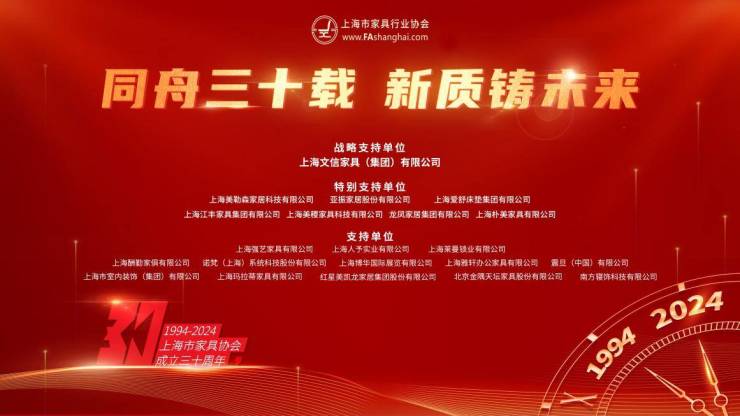 2024年11月29日,“同舟三十载 新质铸未来”上海市家具行业协会30周年庆典在上海举行,百余位重磅嘉宾、企业代表及媒体齐聚一堂,共同见证这一历史时刻。