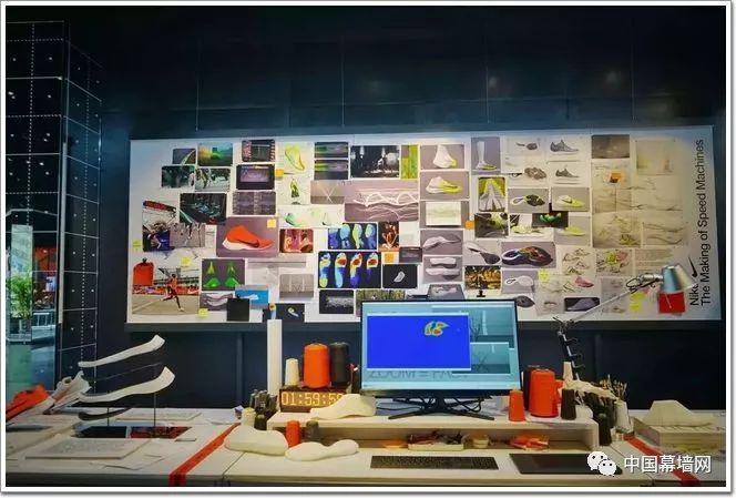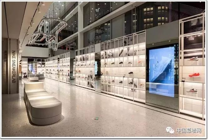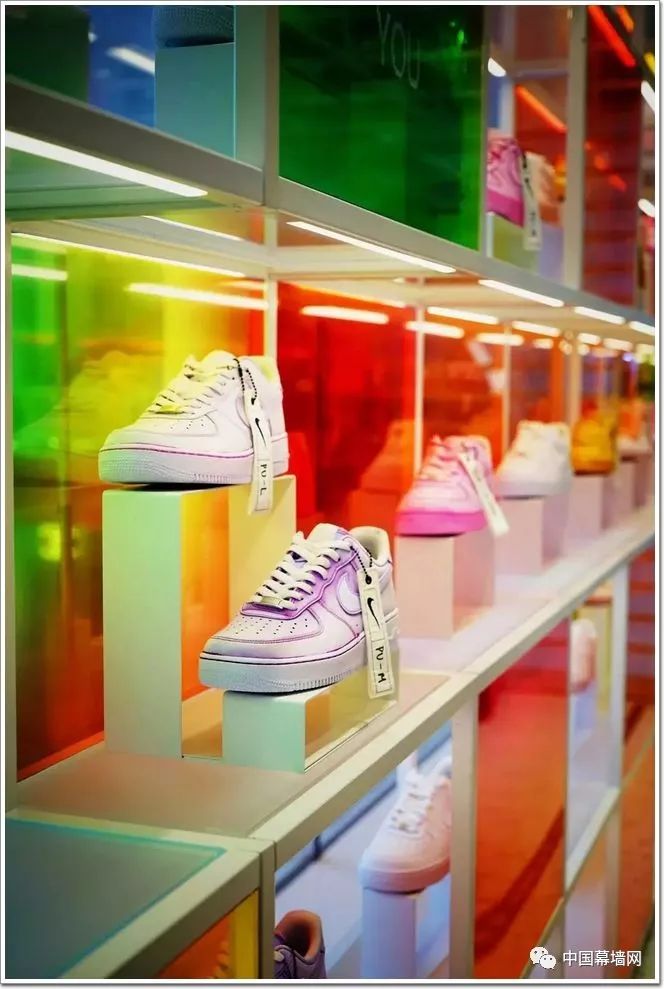 耐克上海 001 共四层空间,建筑面积 3822 平方米,位于南京东路步行街西口的世茂广场。关于耐克的这家店,两层楼高的特殊定制玻璃填满了朝向一整段马路的外墙,每一片玻璃都是凸起的曲面,从远处看,像许多只耐克 Air Max 鞋著名的气垫拼接而成。耐克把这面玻璃墙称为“创新之窗”,而“创新”也是北玻一贯秉持的作风与坚持不懈的动力。