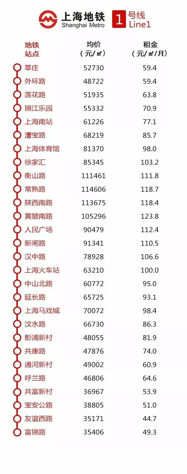 1号线是上海排名前列条轨交线,贯穿着上海人口最密集的地区,从南上海到北上海,从莘庄到宝山,各站点的配套发展得当,1号线各站点的房价也不便宜。