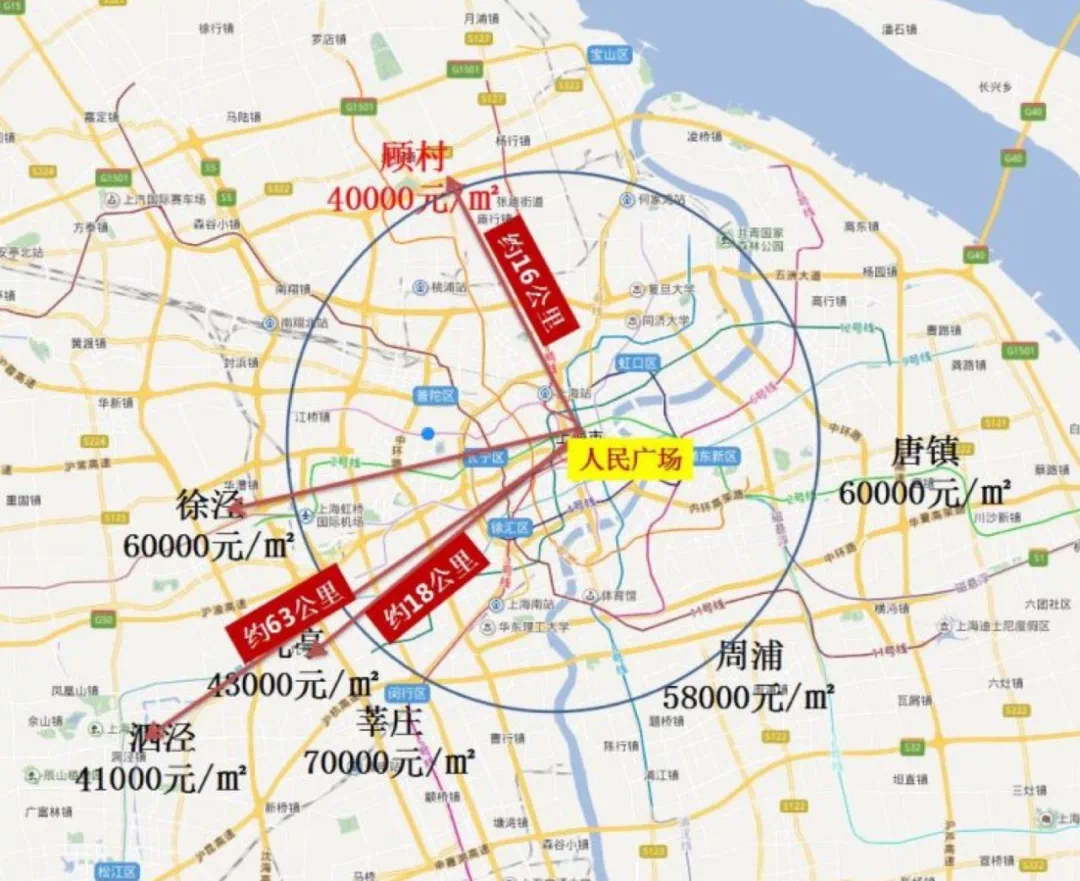 以人民广场为中心,相较于等同距离的上海等环线区域是这样的: