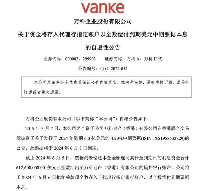 6月5日晚间,万科发布一则自愿性公告称,将全额偿还即将到期的6.126亿美元中期票据本息,所需资金已全数汇出至万科地产(香港)有限公司的境外银行账户,公司将于在6月6日把相关款项全数存入于代理行指定银行账户。