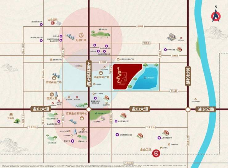 佳运·汇龙府项目东面的地块就是金山区政府与华东师范大学合作共建的九年一贯制公办学校----华师大二附中金山实验学校,目前双方已经签约准备建设。项目周边另有金山小学、海棠小学、金山初级中学、上师大二附中、金山世界外国语学校等名校资源环伺,约1公里内可达万达、百联、思致商圈,依托沈海、新卫、沪金三大高速路网,金山大道、湾区大道、亭卫公路三大城市干道,迅捷链接全城,全方位配套满足业主日常所需。