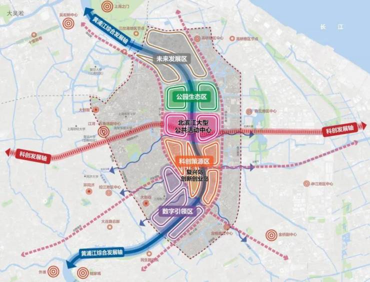 规划提出了“两轴一心四区”的发展结构,以黄浦江沿岸发展轴和翔殷路-五洲大道科创轴为骨架,在北滨江形成公共活动中心,并划分科创策源、数字引领、公园生态和未来发展四个功能区域,推动区域功能融合与能级提升。