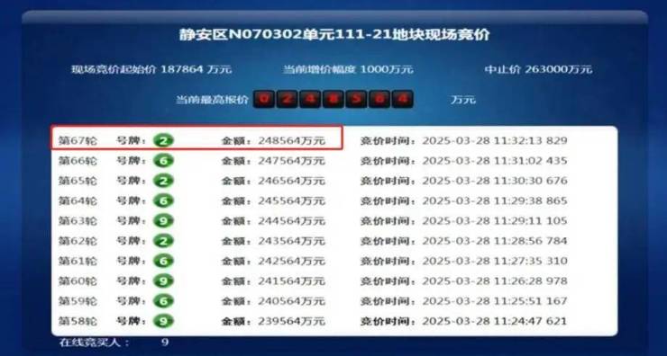 静安大宁地块同样备受关注,共吸引9家竞买人:1#北京城建、2#大华、3#华发、4#中海、5#招商、6#保利置业、7#绿城、8#建发、9#越秀&金茂。