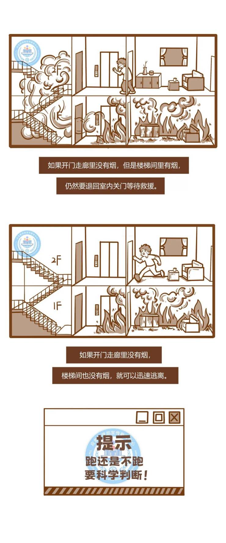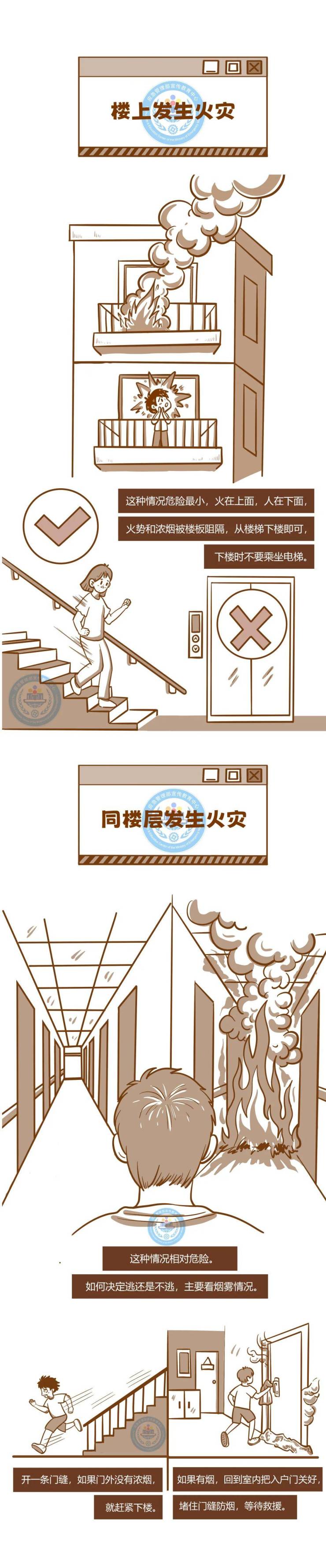 如果火势在楼上,且楼道无明显烟雾,可迅速向下逃生。切记在开门前先检查门把手温度,若门把手不烫,可小心开门观察,确认安全后低姿快速撤离。