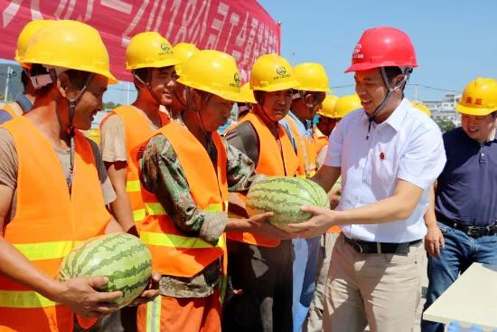 7月20日,在华海公司无锡地铁4号线项目施工现场,项目工会主席把一个个解渴消暑的西瓜,递给在高温下施工作业的工人师傅们。王志刚 王岩/摄