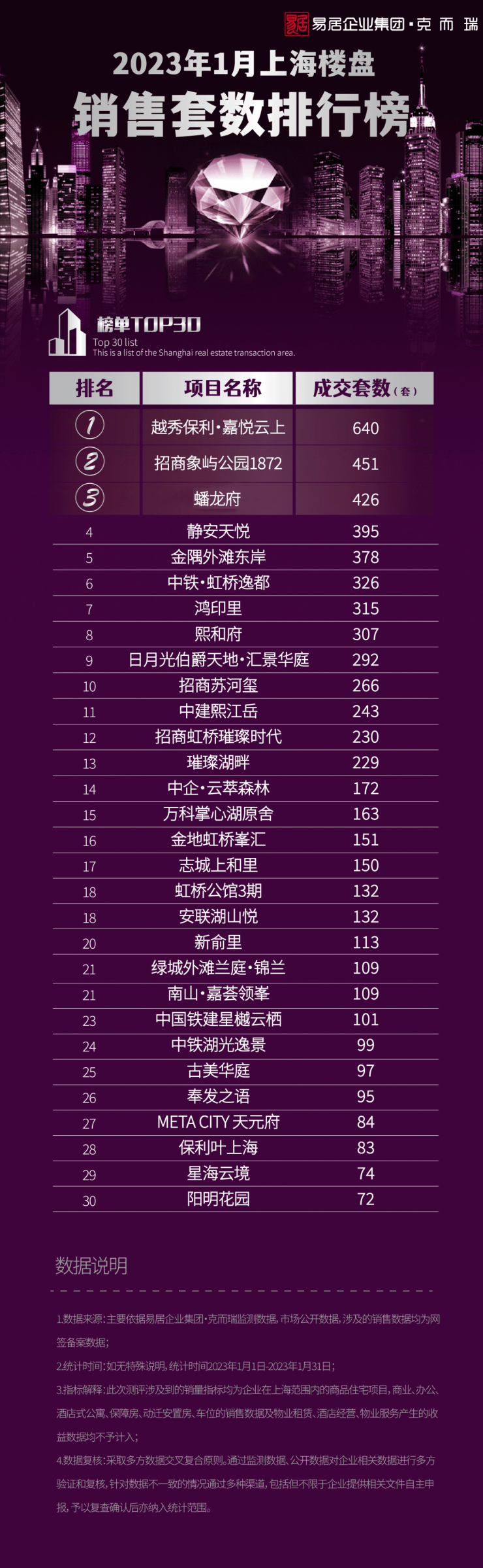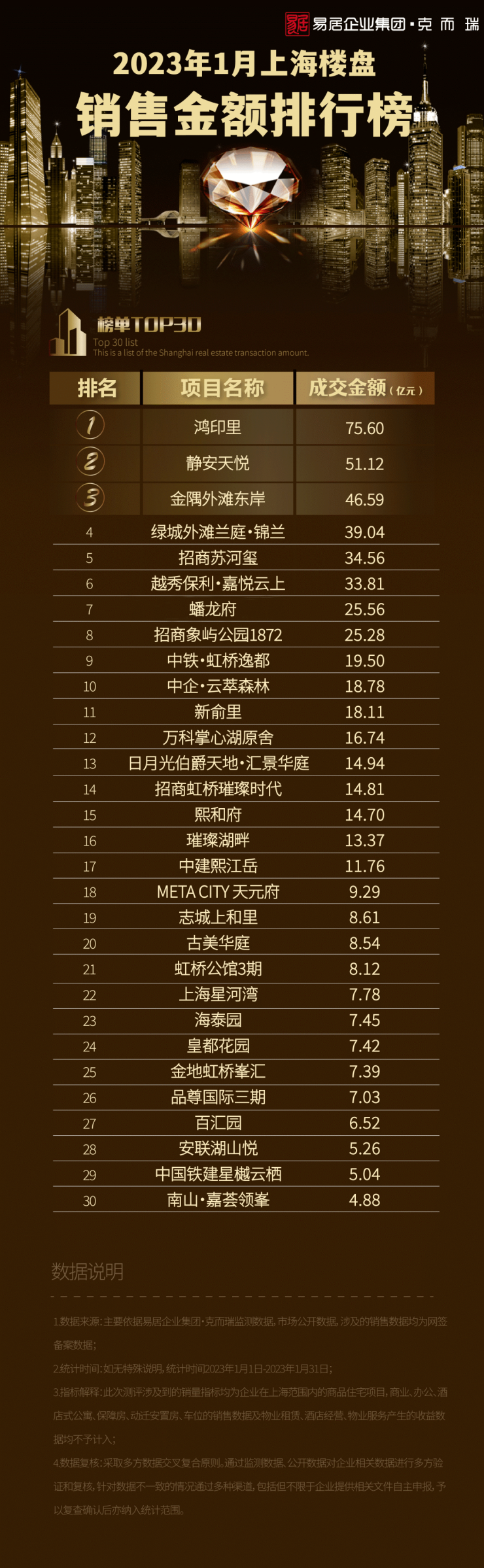 克而瑞:2023年1月上海楼盘销售排行TOP30榜单