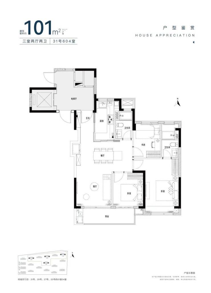 建面约101㎡3房2厅1卫,128套