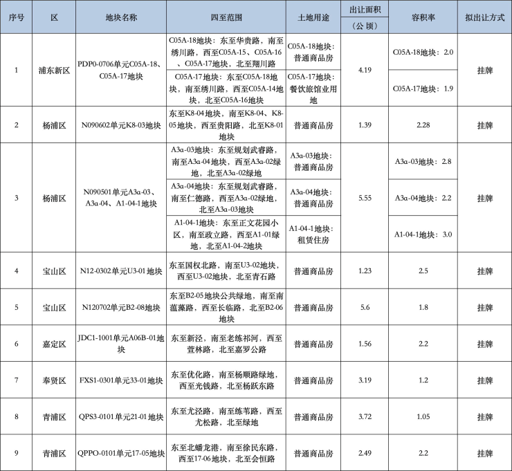 公告显示,第九批次土拍将共推出9宗涉宅地块,分布于浦东新区、杨浦区(2宗)、宝山区(2宗)、嘉定区、奉贤区、青浦区(2宗),总用地面积28.92公顷,总建筑面积约55.2万平方米。本批次计划于11月下旬开始组织交易活动。