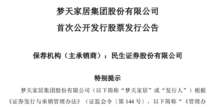 12月1日,梦天家居(603216.SH)发布首次公开发行股票发行公告,公告称,发行人和主承销商根据初步询价结果,综合考虑发行人基本面、所处行业、可比公司估值水平、市场情况、募集资金需求等因素,协商确定本次发行价格为16.86元/股,网下发行不再进行累计投标询价。