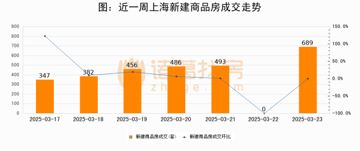 根据上海市房地产交易中心数据显示,2025年03月23日上海新建商品房成交689套,较昨日增加689套,环比上涨0%