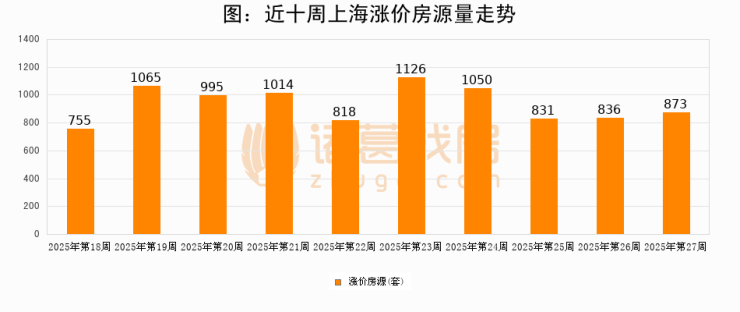 从调价房源来看,第27周上海涨价房源873套,较上周上涨4.4%。与此同时,27周涨价房源占比提升0.59个百分点,业主信心持续恢复。