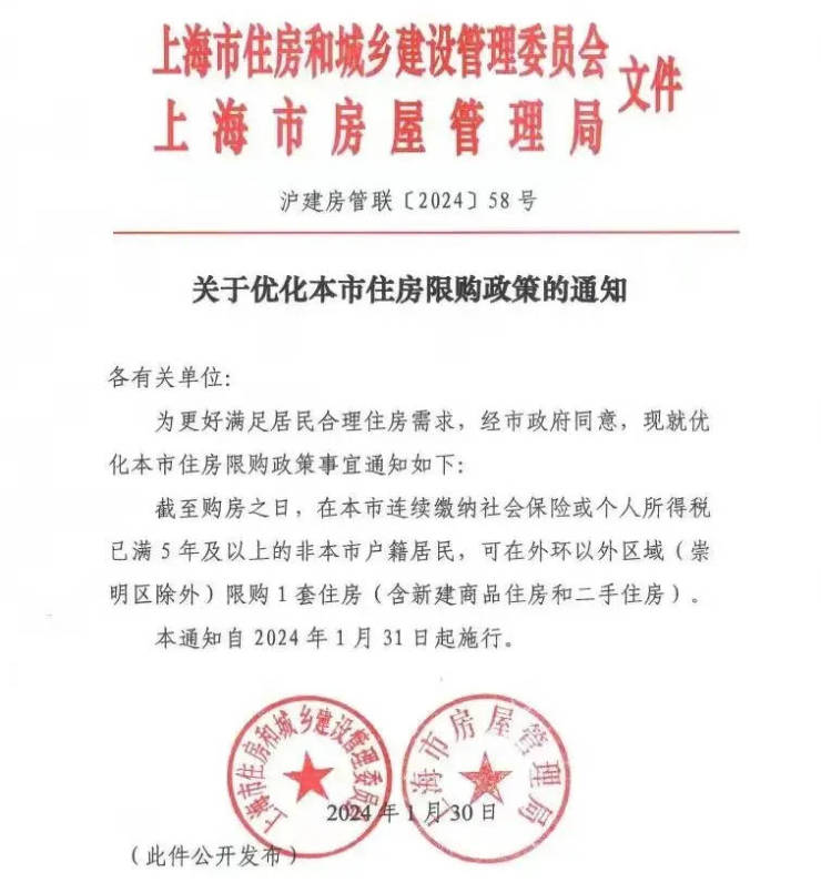 2024.01.30,上海外省市户籍单身放松限购,社保或个人所得税满5年及以上,可在外环以外区域 (崇明区除外)限购1套住房 (含新建商品住房和二手住房)。