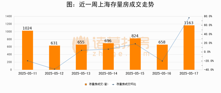 从存量房来看,2025年05月17日上海存量房单日成交1163套,比昨日增加505套,环比上涨76.8%。从近一周存量房成交来看,上海存量房日均成交套数为807套,05月17日单日成交1163套,高于近一周平均水平44.1%。