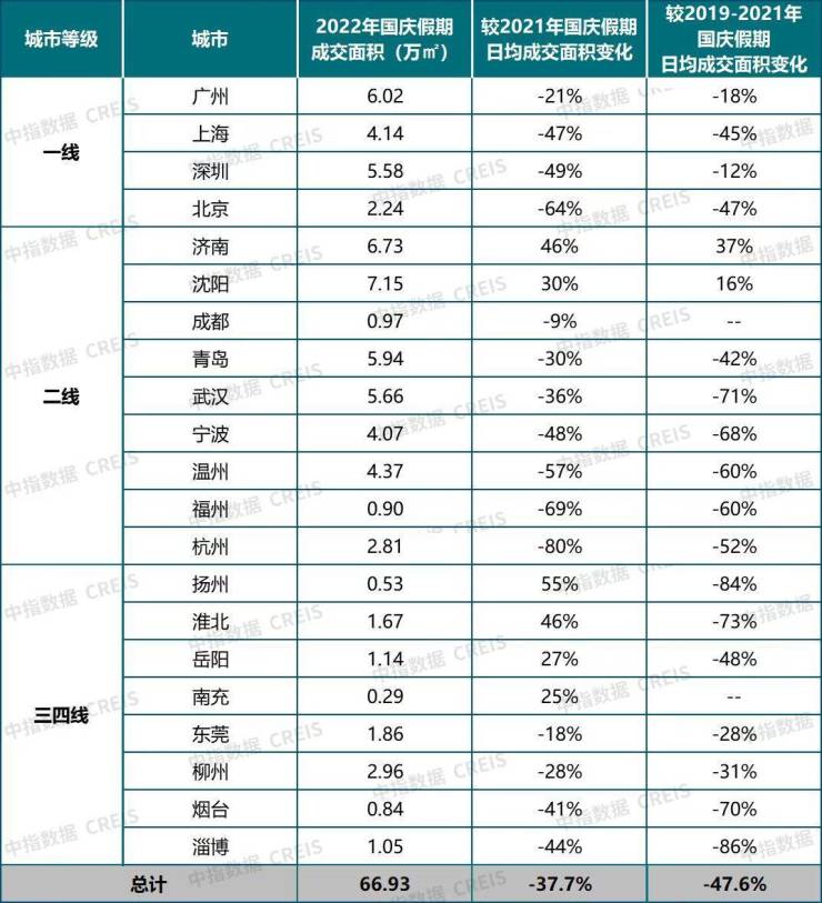 说明:北京2021年国庆假期成交数据剔除恒大两个集中网签项目;总计中较2019-2021年国庆假期日均成交面积变化不含成都、南充。图/中指研究院提供