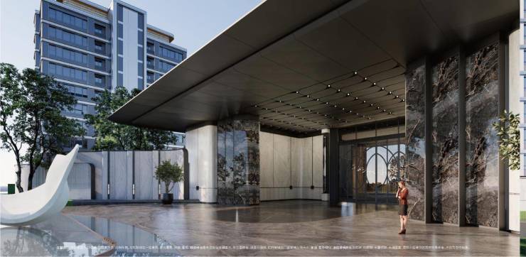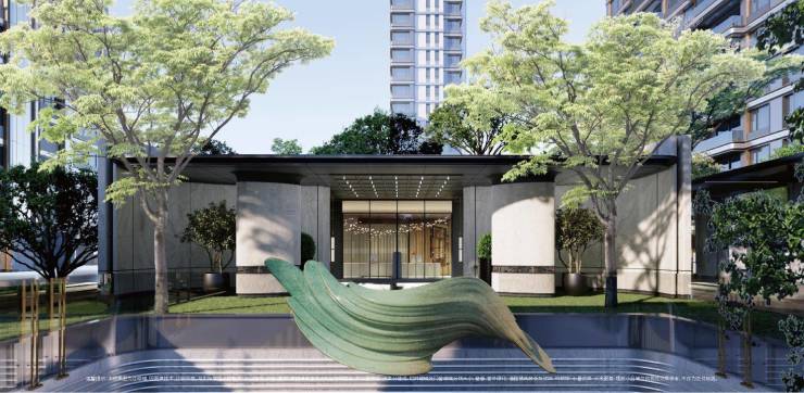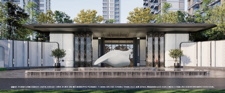 社区入户门庭沿街展开面约88m,辉映上海摩登气质,凝练西派时尚格调,以国际酒店“环岛式”落客布局,环岛中心植入价值百万级《海·回声》大师雕塑作品,地面采用12块连纹奢石整板无缝拼贴,车辆可无感通行至门头底下,以此定制门庭仪式感,启幕一场都会繁华中的艺术之旅。