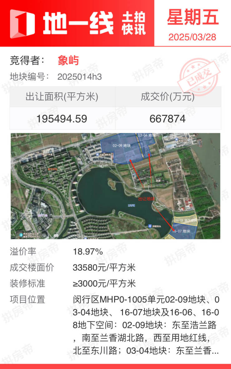 3月28日,闵行区MHP0-1005单元02-09地块、03-04地块、16-07地块及16-06、16-08地下空间完成出让。