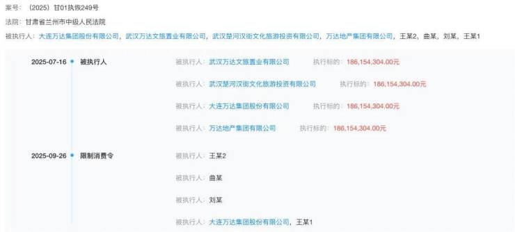 案件审理流程显示,此前7月16日,大连万达集团、万达地产集团、武汉万达文旅置业、王健林等被强制执行1.86亿,执行法院为甘肃省兰州市中级人民法院。