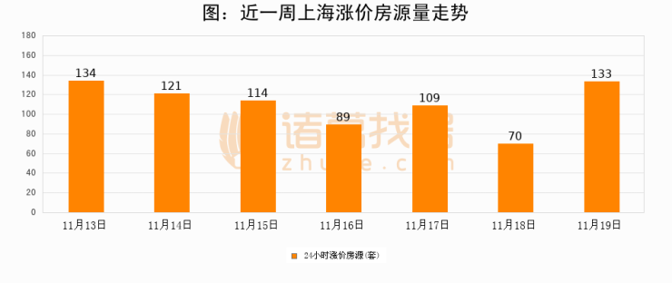 根据诸葛找房数据显示,上海24小时涨价房源量为133套,较11月18日增加63套,环比上涨90%。与此同时,涨价房源占比小幅扩大,业主信心有所提升。