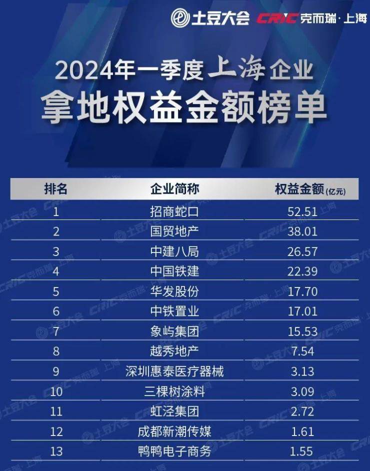 据统计,上海2024年一季度共成交商住办用地11宗,成交建面81万㎡,总金额达到209亿元,成交总建面同比上涨741%,成交总金额同比上涨2630%。各企业斩获情况详见下图: