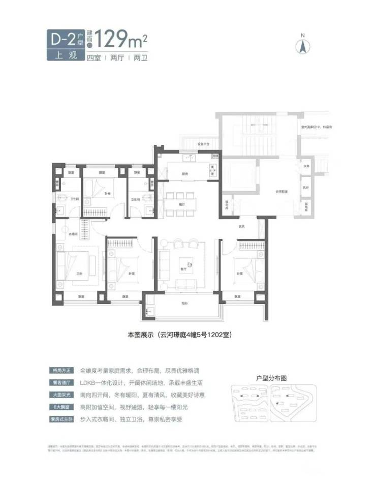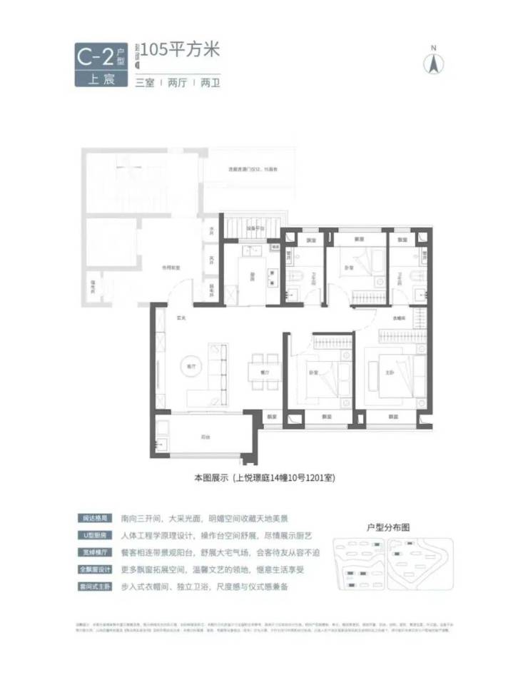 适合家庭成员简单的三口之家或是与老人同住的家庭,卧室间互不影响;动静分区设计;主卧套房设计隐私性更强;经典厨房、餐厅、客厅及阳台一体化设计,南北通透相当大气,270度转角阳台更是设计了洗衣空间,非常实用!