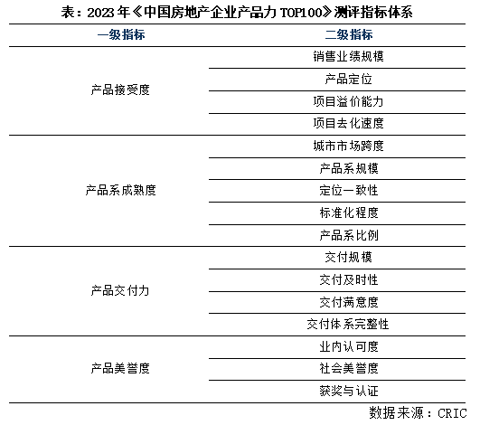 2023年《中国房地产企业产品力TOP100》共分为四个一级指标,今年在往年指标体系的基础上,将“产品交付力”作为一级指标加入其中,从“产品接受度”“产品系成熟度”“产品交付力”“产品美誉度”四个维度对企业产品力进行测评。
