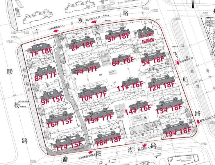 项目主出入口位于南侧鄱阳湖路,社区内规划有下沉式庭院以及大量的架空层;地面有预留部分车位,非完全人车分流。