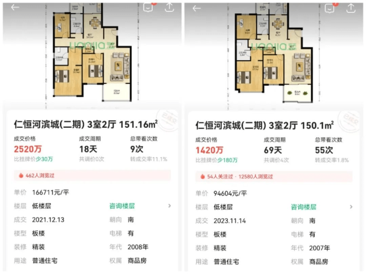 网传图中,同样的房型,同样位于低楼层,2021年12月份成交价16.67万/㎡,2023年11月成交价9.46万/㎡,两年不到,跌幅高达56%!且从带看次数和成交周期看,2023年11月成交的房源带看次数更多、成交周期明显拉长。