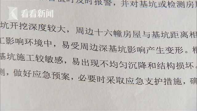 记者在现场看到,好几户民居的确内外墙均有不同程度开裂,有的甚至属于贯穿伤。据了解,在开工前后,施工方曾做了三次房屋损坏趋势检测,显示民居房屋主体结构完好,但也承认,周边十六户居民房屋容易受到深基坑影响产生形变,要加强检测做好预案。而眼下,海玥铭邸小区已经结构封顶,虽然之前有过相关承诺,但相关居民一谈及受损房屋修复及赔偿,施工方就没有下文了。