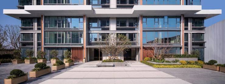 进入单元楼前,看到的是多层次植物营造的泛景观入户,以对称的方式呈现,四季芬芳的绿植,让归家仪式感再上一层。