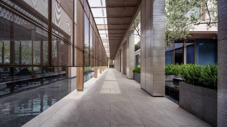 移步来到水榭光廊,阳光透过格栅在地上形成斑驳的光影,与单侧的水景波动的涟漪互动,让归家动线景观更加生动。