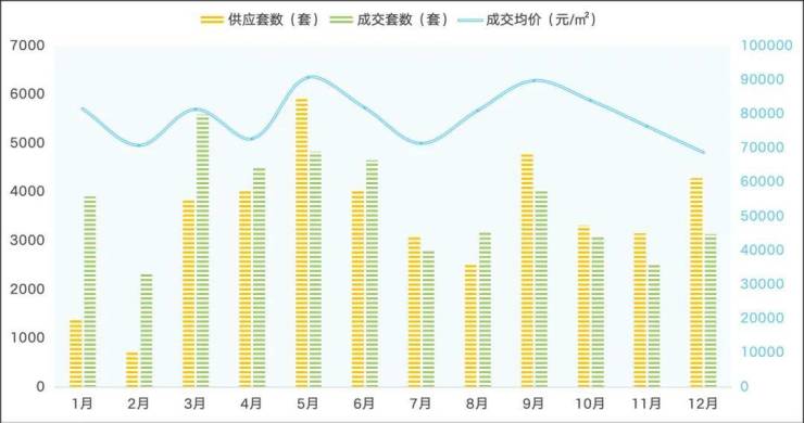 5月均价突破9万元/㎡,达到90691元/㎡的月度峰值;9月在政策提振下均价也接近9万元/㎡。然而12月均价大幅回落至68710元/㎡,创全年新低,反映出年末市场以价换量、结构偏向中低价位产品的特点。全年均价多数月份仍维持在8万元/㎡上下,支撑了整体均价的上涨趋势,价格韧性依然存在。