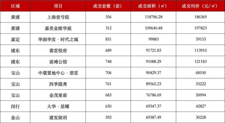在成交面积前十榜单中,上海壹号院、嘉里金陵华庭、华润华发·时代之城位列前三,其中前两个项目成交面积均超过10万㎡,显示出高端项目不仅单价高,去化速度也相对较快。