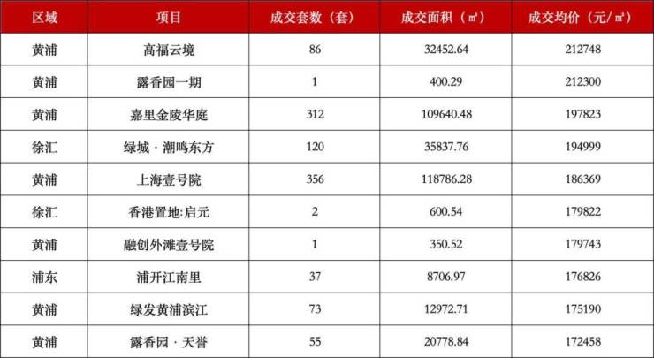 从具体项目表现来看,单价10万+项目在成交榜单中占据主导地位。高福云境以21.27万元/㎡的均价创下年度新高,露香园一期、金陵华庭、绿城·潮鸣东方、上海壹号院等项目均价也接近或突破20万元/㎡。