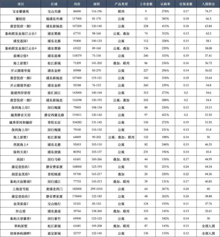 数据显示,认购率超400%仅有2个项目,认购率超300%有5个项目。最高入围分是宝山宝业馨康苑,老盘加推,因为只有非常少的9套联排,入围分达到74.37;蘭桂坊、翡雲悦府、象屿联发金海汀云台三个项目入围分均在60以上;50及以上入围分项目数量共14个,占比最多。分数最低的是象屿天誉蘭香,仅30。