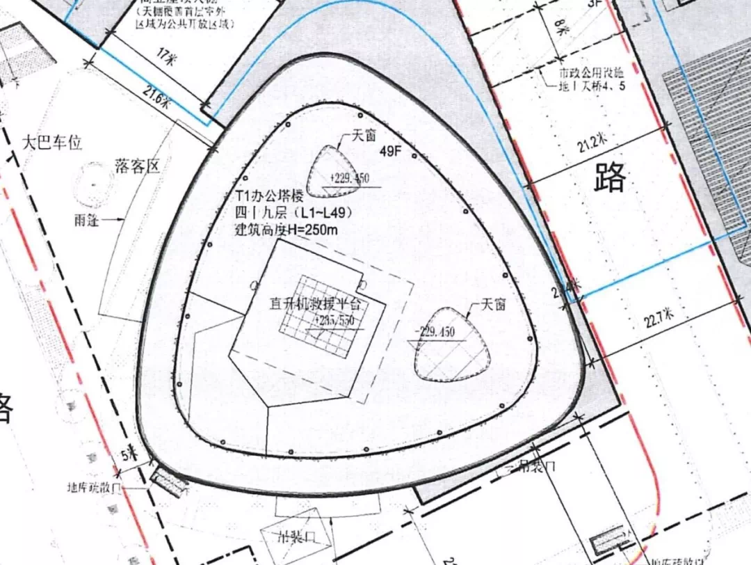最受关注的250米新天地较高地标为项目T1塔楼,共49层,在235.55米的高空将建设一座直升机停机坪,还开了两个天窗,颇有意思。