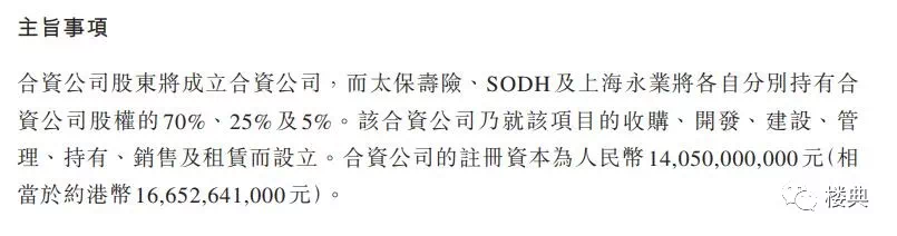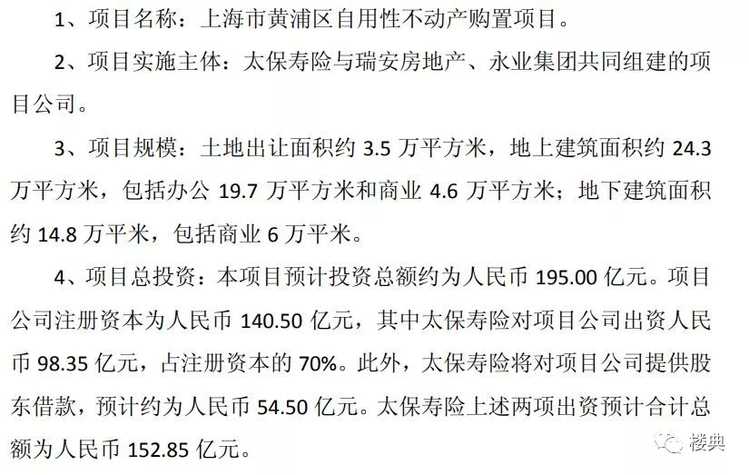 而实际上,整个项目的195亿投资中,太保除了98.35亿的地价款之外,还提供了54.5亿的股东贷款,整体出资152.85亿,占总投资的80%,所以说太保在整个项目中占有特别的话语权,而瑞安将会成为一个类似于资产管理方的角色负责项目的开发和运营,而永业作为5%小股东,让黄浦政府能够充分了解项目的开发情况。
